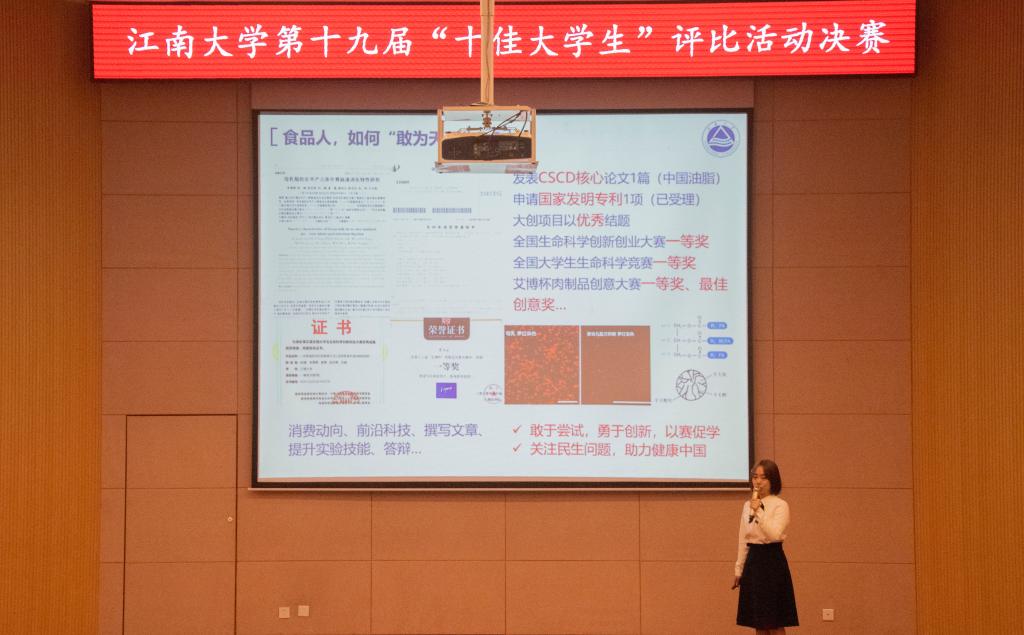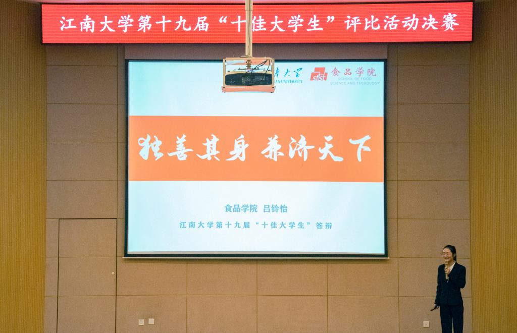 经学院推荐、网络投票、材料评审等环节,食品学院陈嫣、吕铃怡一路过关斩将,顺利成为“十佳大学生”候选人,入围决赛(全校共15名)。在决赛环节,各位优秀候选同学依次进行个人展示、专题问答和观众投票,经过激烈角逐,陈嫣、吕铃怡两位同学双双荣获江南大学“十佳大学生”称号。