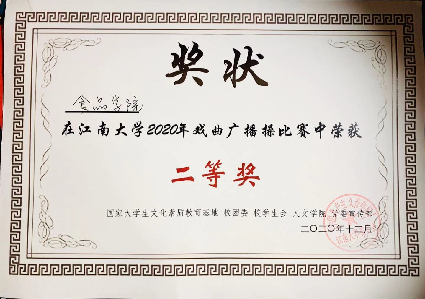 近日,由国家大学生文化素质教育基地和校团委联合主办的江南大学第四届戏曲广播操大赛在江南大学体育馆举行,食品学院戏曲广播操队从全校15支参赛队伍中脱颖而出,以96分的好成绩荣获大赛二等奖。
