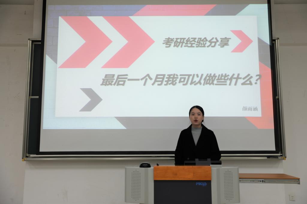 会议还邀请了2021届毕业生、食品学院食硕2107班颜雨涵进行考研分享。颜雨涵同学分享了自己的备考状态,从各项考试科目的准备内容为考研学生提出建议,耐心解答同学们的问题。