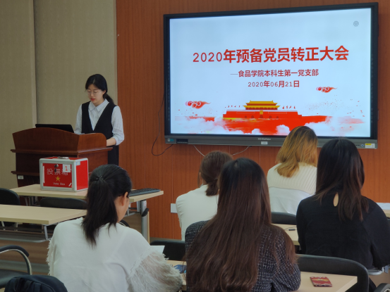 6月21日上午,食品学院本科生第一党支部在学院D522举行毕业生预备党员转正的党员大会。会议由党员潘雨琦主持,支部全体师生党员参加。