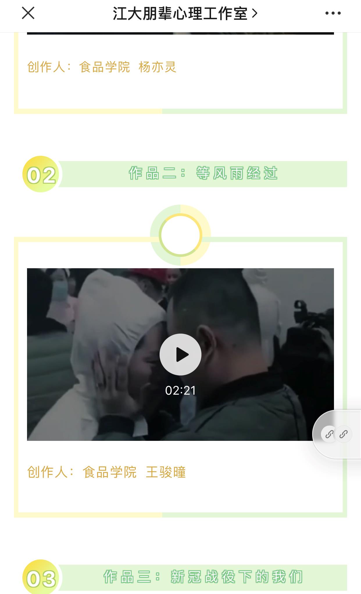 活动期间,食品学院各班同学积极参赛,踊跃投稿,其中食质1902班吴洁茹、食科1902班黄家祺、食科1903班包维佳、食科1908班李亚茹同学向我们展示了在疫情中挺身而出、冲锋在前的新时代青年形象,食科1907班陈昕玥同学的视频体现了中华民族的强大凝聚力与乐观不屈的精神,食科1903班杨亦灵、食科1903班张雪怡、食科1906班刘芷阁、食科1908班丁玉婕同学让我们看到具有使命担当的个人与具有大国担当的国家,食质1801班夏中瀚同学则让我们感受到了同心同德共克时艰的信心。最终学院从19项投稿作品中选择10项优秀作品,报送给学校心理健康教育中心择优展示。
