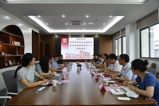 2020年6月16日,苏州市吴江区太湖新城经发局局长陈建刚、组织劳动人社局副局长万能一行8人来访我院。食品学院院长刘元法、院长助理程力等人参加了座谈。