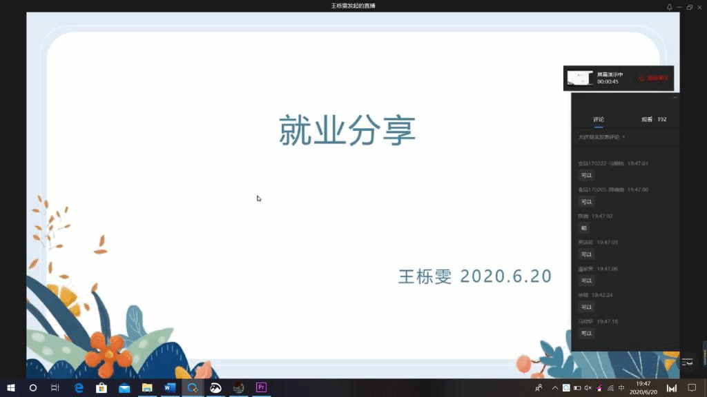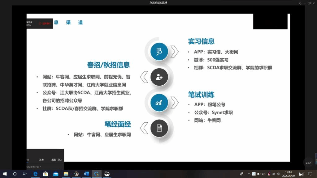 为不断强化2021届毕业年级同学就业创业信心,做好疫情防控形势下的就业帮扶工作,6月20日晚,食品学院举办“身边的榜样,前行的力量”2020届优秀毕业生分享会之就业创业专题活动,邀请陈慧、杨志杰、王栎雯三位毕业生分享自己的成功就业经验,270余名同学积极报名参加此次活动。