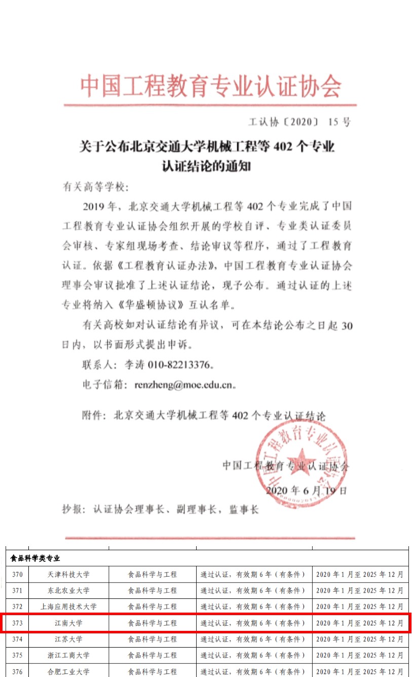 近日,教育部高等教育教学评估中心下发《关于公布2019年度通过工程教育认证专业名单的通知》(教高评中心函【2020】55号),我院食品科学与工程专业继2007年首轮、2013年第二轮通过工程教育专业认证之后,再次顺利通过该认证,有效期6年(2020年1月至2025年12月)。