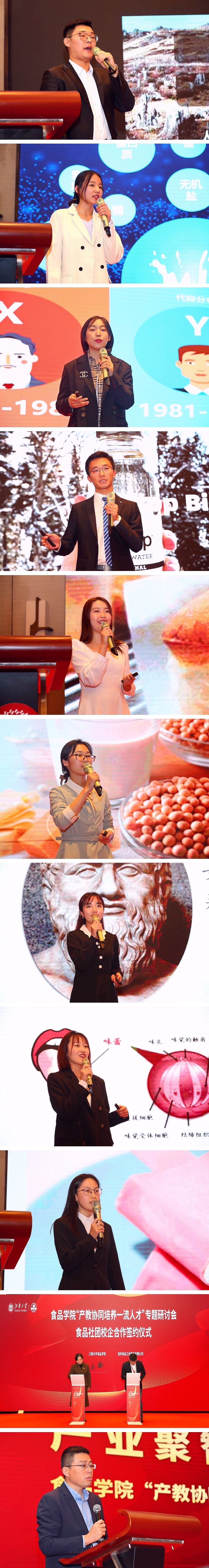 一直以来,食品学院注重加强产教协同,尤其注重引入企业资源助力学生培养。学院董事单位企业在学院设立社会奖助学金,协同学院开展学科竞赛,为学生成长搭建平台。论坛上,从学科竞赛中走出来的优秀创新创业成果进行了路演,“森帝科—无醛淀粉基木材胶引领者”、“美益佳—‘纸’为乳品安全”、“叫楂楂甜辣鲜菇酱”、“Spring Budding‘童桦’桦树汁发酵乳饮料”等项目获得企业一致好评。