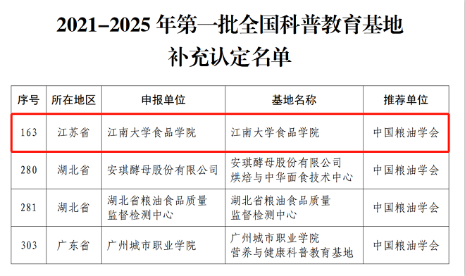 近日,中国粮油学会在遴选出的11家中国粮油学会科普教育基地基础上,积极推荐部分基地参加全国科普教育基地创建工作。其中,bat365在线官方网站、安琪酵母股份有限公司、湖北省粮油食品质量监督检测中心和广州城市职业学院成功入选中国科协“2021—2025年第一批补充认定的全国科普教育基地”。
