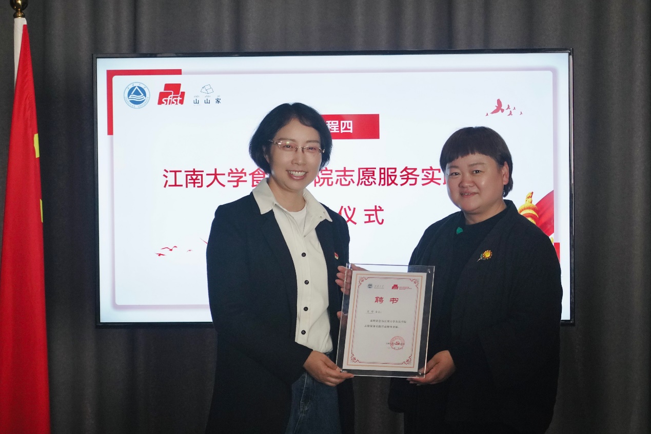 活动最后,傅莉莉为王平颁授食品学院志愿服务实践活动指导老师聘书。师生们共同学习了山山家企业自2003年创办以来,树立服务社会、感恩社会、回报社会的公共意识和社会责任,从细微处着手,于点滴中坚持,将雷锋精神和公益理念浸润入企业文化,传递到每一位员工心中的理念与实践。