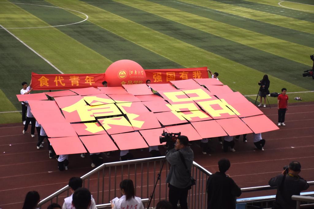 本届运动会开幕式继承往年传统,采用入场仪式与团体展演相结合的形式。国旗、校旗、会徽方阵气宇轩昂、步履铿锵,诠释江南体育精神。食品学院方阵由46名本科生和研究生共同组成,代表着全院3600名师生员工。他们进的了实验室搞科研,战的了田径场争金牌!紧随方阵的巨型红球,寓意“红日初升,其道大光”,每一位学子背后都是食品学院争先创优、光芒万丈的精神依靠。江南食品人,敢为天下先。“食”代学子将赓续使命,续写华章!