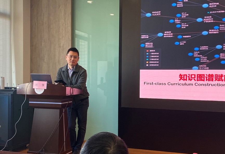 随后,刘强作题为“知识图谱赋能一流课程建设和教学创新”的精彩报告。他从教育数字化转型和知识图谱、知识图谱构建及其关系辨析、知识图谱如何赋能一流课程建设、知识图谱如何赋能混合式教学创新,四个主要方面进行了详细的介绍和分享。同时引用大量的案例和数据,展示了知识图谱在化学化工领域的应用和效果,引发了现场教师的强烈共鸣和热烈讨论。他还介绍了湖南大学化学化工学院在知识图谱方面的探索和实践,包括建立了化学化工知识图谱平台、开发了基于知识图谱的智能教学辅助系统、推进了基于知识图谱的混合式教学模式等。他鼓励食品学院的教师积极利用知识图谱,创新教学方法和学习方式,提升教学质量和学习效果。