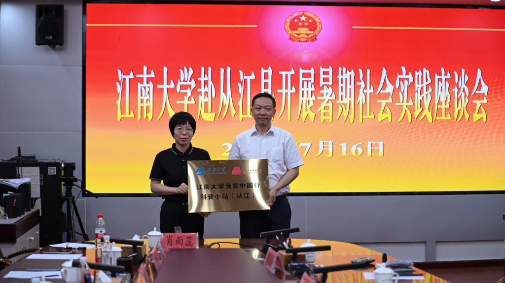 讨论交流环节之后,陈艳君代表学校向从江县颁授“江南大学食育中国行科普小站”铭牌;李雷代表学院向从江县颁授“bat365在线官方网站实践育人校外基地”铭牌。此次授牌,为进一步巩固校地合作夯实了基础,也为食品师生在黔东南地区长期有效开展食育科普实践活动按下了加速键。