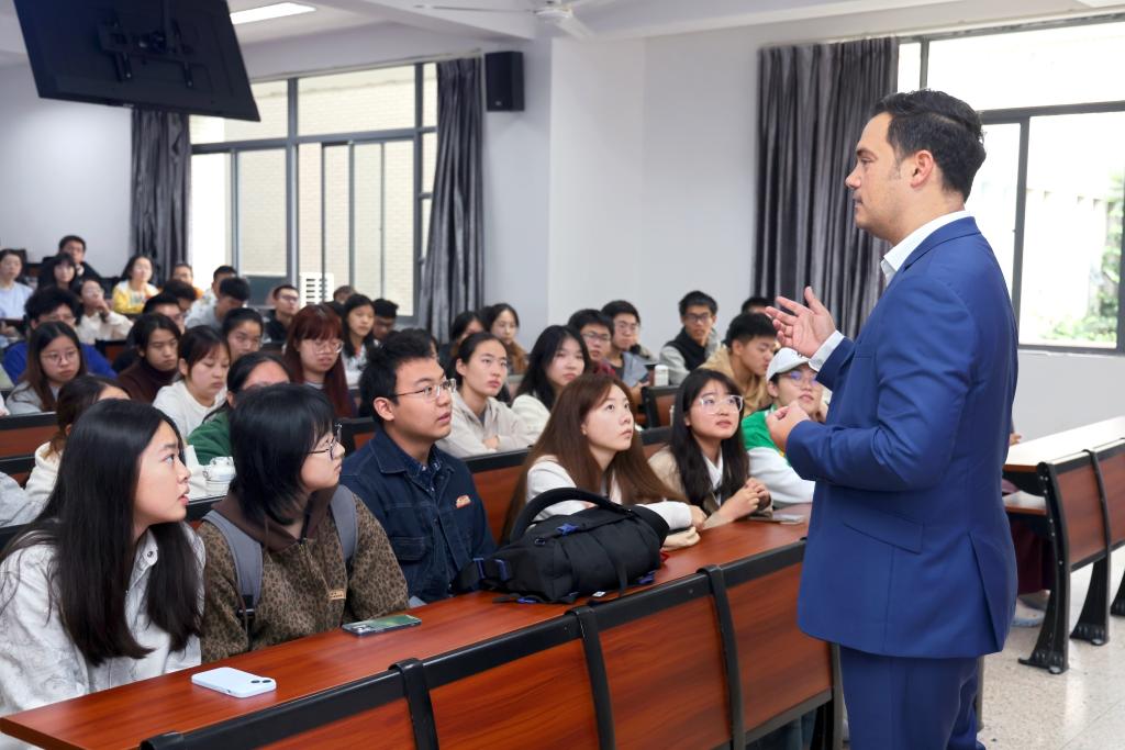会前,Tere McGonagle-Daly一行前往第二教学楼,与食品学院国际班学子亲切会面。他向大家介绍梅西大学的办学条件与生活环境,鼓励同学们努力学习、充分准备,盼望尽快在新西兰聚首。