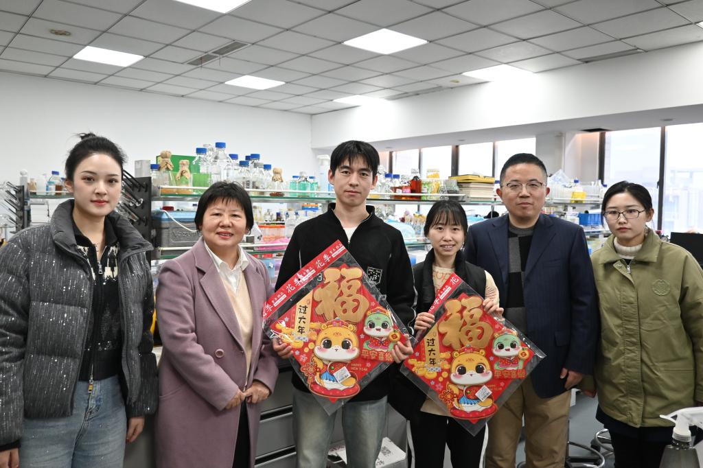 1月23日上午,食品学院副院长孙秀兰、党委副书记李雷、研究生辅导员胡卉君、本科生辅导员周雨洁一行走进实验室看望留校学子。师生们交流实验进度和留校日程。老师们叮嘱同学们要充分利用好假期时间,多学习,勤锻炼,劳逸结合,并守牢实验室安全防线。学院还特别为留校学子准备了新春福字,让同学们在这里感受到“大院小家”的食品文化。