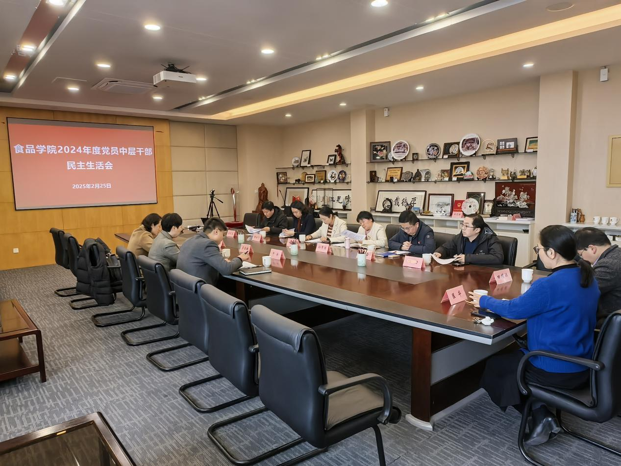 2025年2月25日上午,食品学院2024年度党员中层干部民主生活会在食品楼D910会议室召开。校党委委员、宣传部部长李佳敏同志,校纪委委员、机械工程学院党委书记高雪梅同志列席指导。食品学院全体党员中层干部出席会议。会议由学院党委书记傅莉莉主持。
