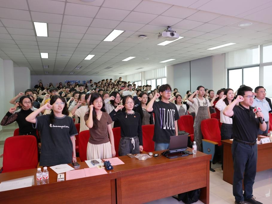 “我志愿加入中国共产党……永不叛党”,在食品学院D912报告厅主会场与D917分会场,300余名毕业生党员、新发展党员在学工办主任兼分团委书记李金杰的带领下庄严宣誓。铿锵誓言回荡会场,党员们眼神中闪烁着信仰的光芒。本科生第一党支部曾美怡作为新党员代表发言时表示,这是对政治生命的郑重宣告,更是对“为人民服务”宗旨的永恒承诺。熟悉的字句唤醒入党初心。“当右手握拳过肩时,实验室里‘求真务实’的精神与党旗下的誓言交叠,我更加明确了作为江南食品人的使命担当。”食硕2203党支部孟逸云作为毕业生党员代表发言如是说。