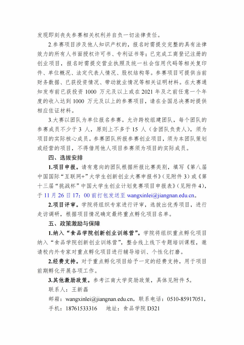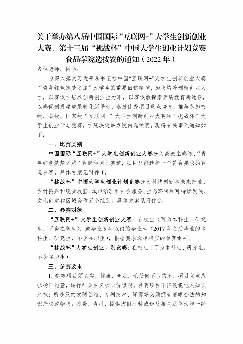 关于举办第八届中国国际“互联网+”大学生创新创业大赛、第十三届“挑战杯”中国大学生创业计划竞赛食品学院选拔赛的通知(2022 年)